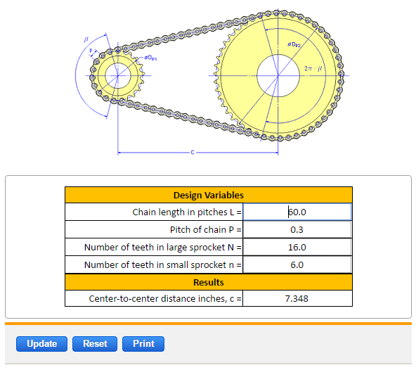 - Input the sprocket dimensions, including the number of teeth and pitch